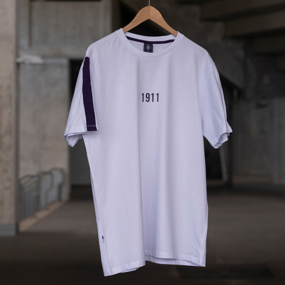 Tradition für die Kleinsten! Dieses weiße Kinder T-Shirt mit dem legendären "1911" Schriftzug und violett-weißen Tape-Akzenten an den Ärmeln ist perfekt für junge Austria-Fans. Leicht, bequem und voller Geschichte – dein Kind trägt damit ein Stück Vereins-DNA.